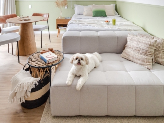 “O couro é uma excelente opção para casas com cães, pois é resistente e fácil de limpar. Já para tutores de gatos, não é o mais indicado, já que o hábito de arranhar pode danificá-lo rapidamente”, explica.