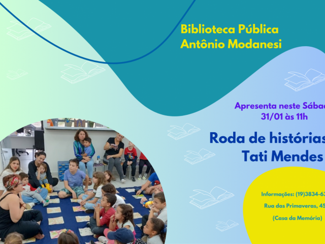 A Secretaria Municipal de Cultura realiza neste sábado, 31 de janeiro, a partir das 11h, uma Roda de Histórias com a arte-educadora Tati Mendes. A atividade tem entrada gratuita e é voltada para crianças e suas famílias.